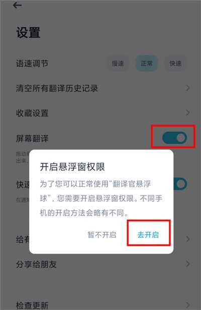 3、在设置页面中找到【屏幕翻译】,开启该功能,并点击【去开启】以授予悬浮窗权限。