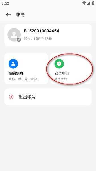 2、在账号界面中,点击安全中心”,选择修改密码”选项。