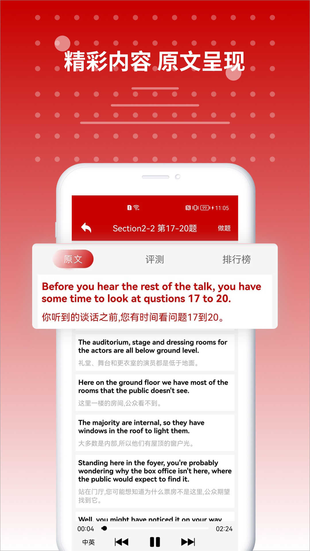【多模式听力训练】 支持仅听音频”显示题目”同步原文”等多种练习模式,循序渐进提升听力理解力,适应不同阶段的学习需求。
