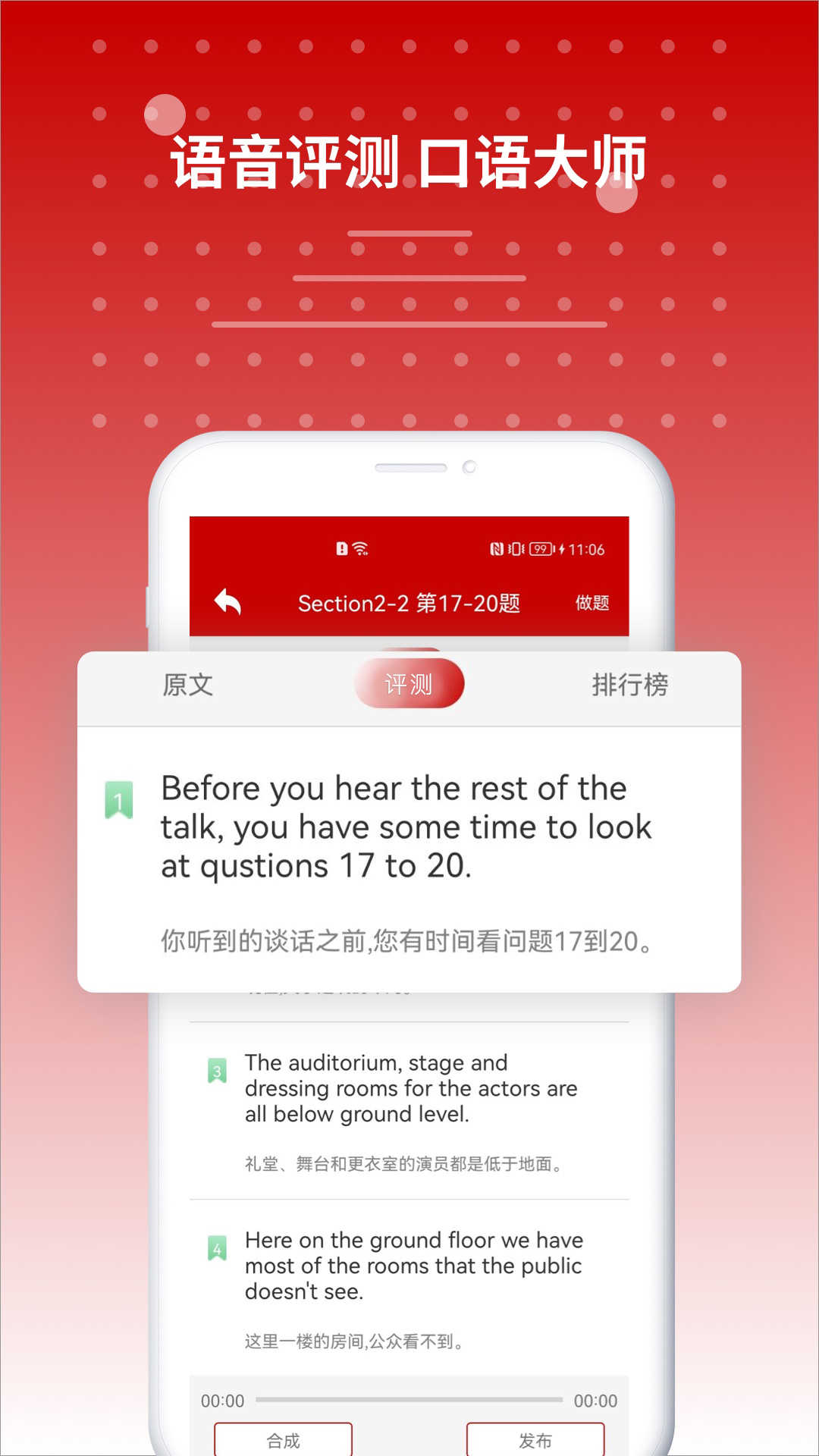 【智能测评与个性化建议】 通过模拟真实考试环境,系统自动评估你的听力、阅读、口语及写作能力,并基于结果推送定制化学习计划,精准补弱提强。