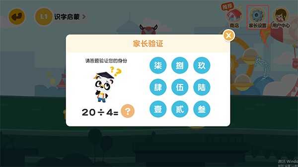 打开熊猫博士识字软件后,点击首页右上角的家长设置”。系统会先通过简短答题验证您的家长身份,确保儿童使用环境的安全性。