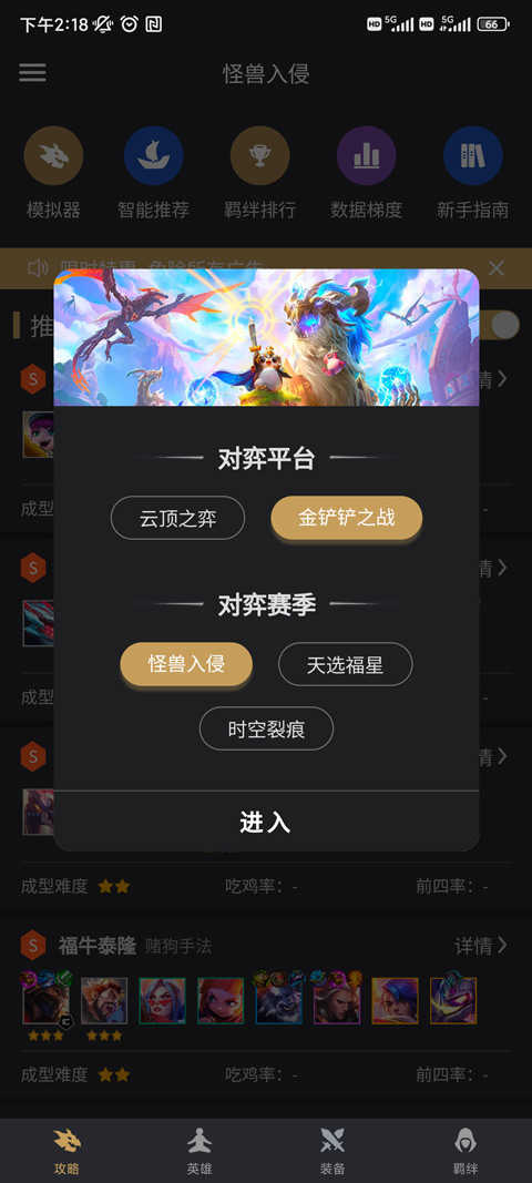 1、打开应用后,选择金铲铲之战”,并进入你想体验的赛季模式,如怪兽入侵”、天选福星”或时空裂痕”等。