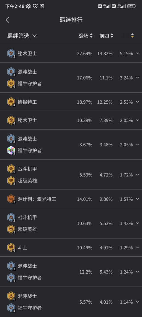 7、进入羁绊排行”,可查看各羁绊的登场率、前四名胜率等数据,掌握版本主流趋势。