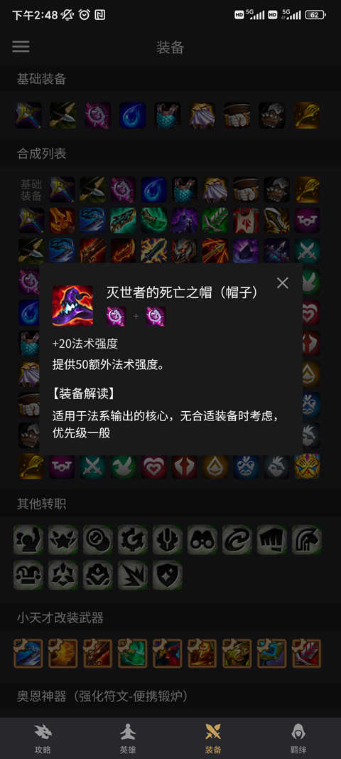 6、在装备”界面,不仅可查看所有基础装备与强化符文,还能点击合成列表”了解完整装备合成路径与属性加成。