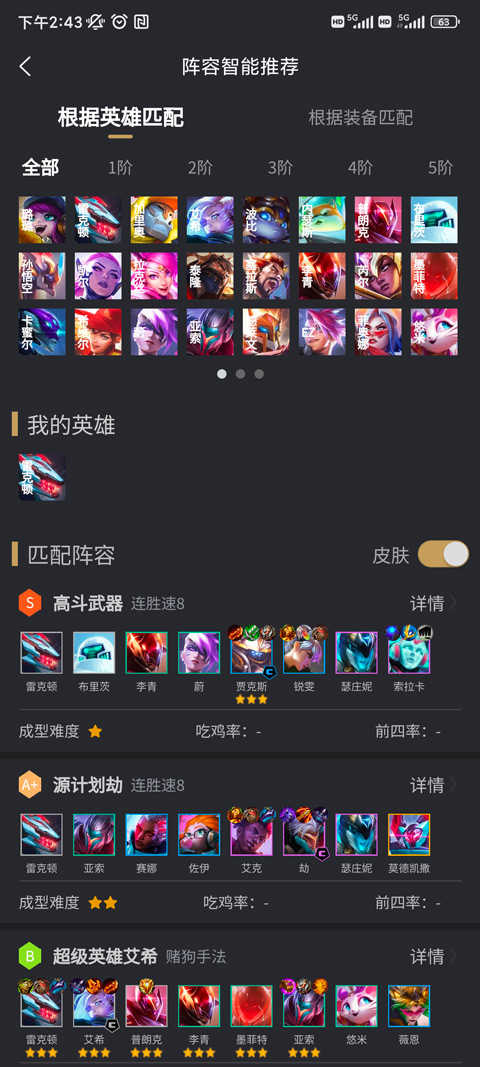 4、点击英雄”模块,可按费用、种族或职业三种方式筛选所有英雄,点击任意英雄即可查看其技能、蓝量、属性及装备适配详情。
