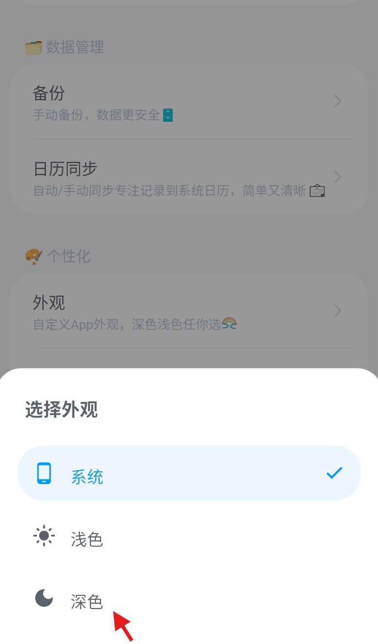 3、在外观设置页面,选择深色”主题,即可立即切换界面风格,享受更舒适的夜间使用体验。