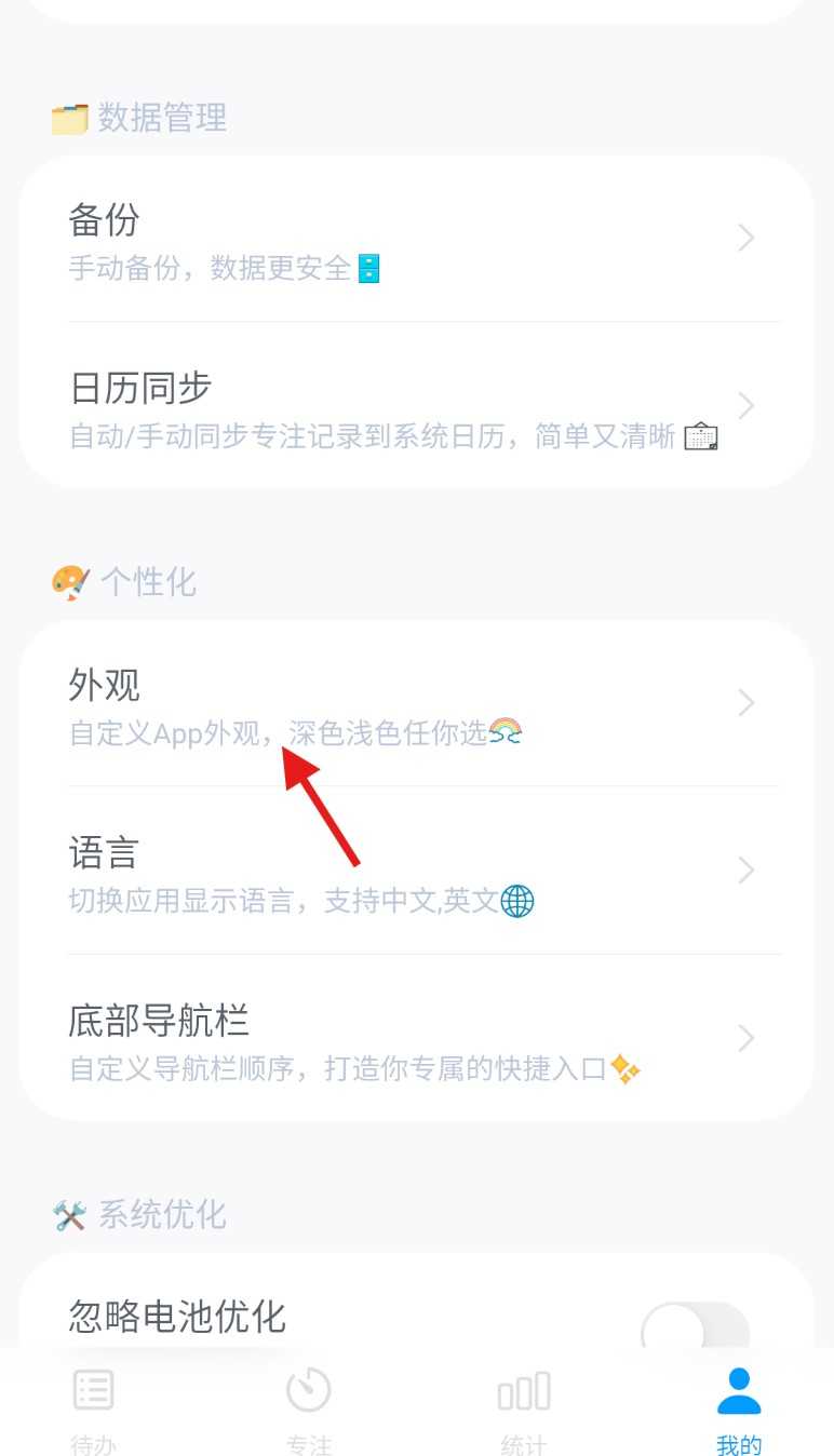 2、在我的”页面中向下滑动,找到并点击外观”设置选项。