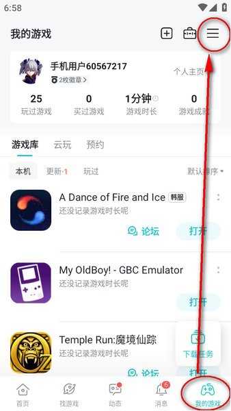 打开taptap登录账号后,点击底部我的游戏”,选择右上角的三条杠;