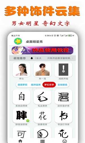 桌面明星秀app包含了迷你漫步体、书法行书体、叶根友童体、可爱丫丫体、友圆童卡体、扶桑花体、胖娃迷你体等大量个性鲜明的字体素材,您可以通过选择不同字体,编辑您喜欢的文本装饰在桌面任意位置。