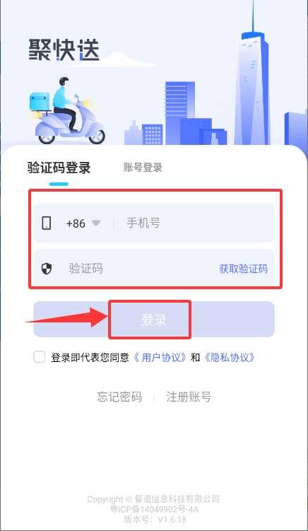 3、注册成功后输入手机号与验证码,点击登录即可开启配送服务功能。