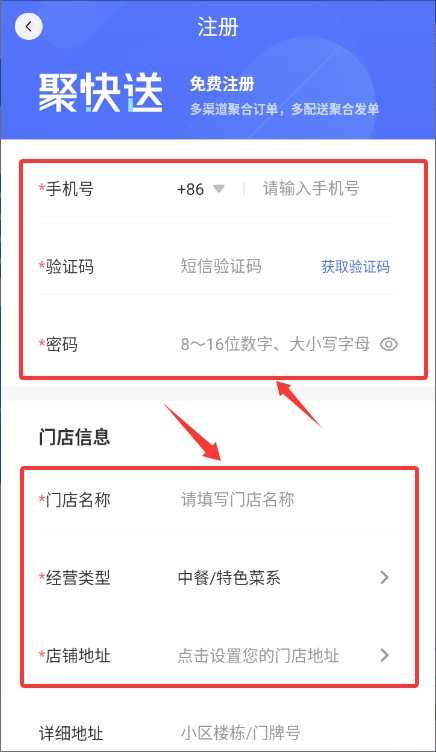 2、填写手机号、验证码、密码及门店信息,完成聚快送账号注册流程。