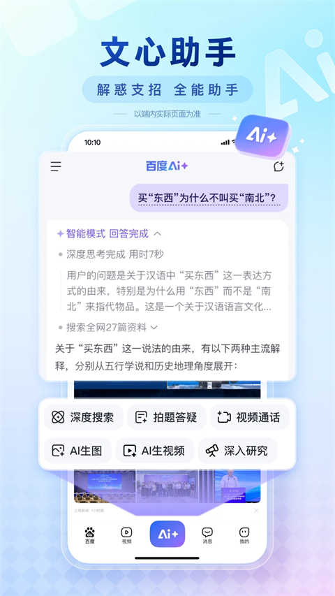 AI全能助手,即时解决你的所有问题。深入研究、深度搜索,为你解决复杂问题;AI拍题,一键解惑学习难题;AI生图、AI生成视频、AI写作,精彩内容跃然屏幕,还能AI语音通话、视频通话、文字聊天,带给你全新的AI体验!