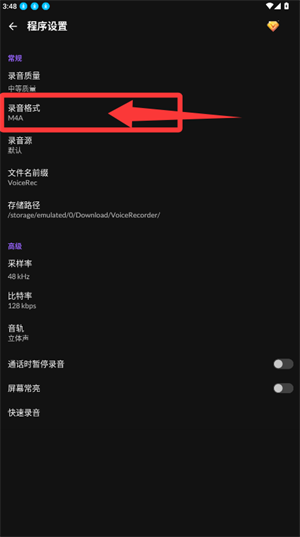 2、在“常规设置”中找到“录音格式”选项并点击进入。