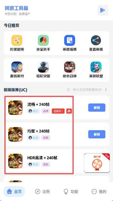 阿浪工具箱画质助手集多项实用功能于一身,全面释放手机游戏潜能:支持修改游戏画面比例,提供16:9、18:9、20:9等多种选项,适配不同屏幕;增强地图细节清晰度,助你精准识别敌人位置与环境要素;所有功能完全免费开放,无需内购或订阅。
