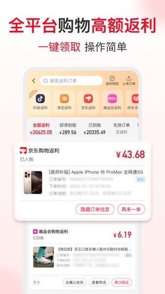 2、创新构建购物即返现商业模式,通过平台跳转下单可获得高额现金返利,支持提现至账户。