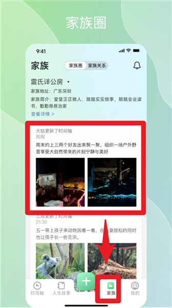3. 进入家族圈”页面,查看家人动态、互动留言,共同维护家庭记忆空间。