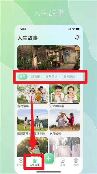 2. 点击底部导航栏人生故事”,即可浏览推荐内容或选择童年回忆”等分类开始创作。