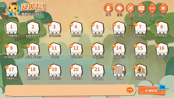 1、打开《少儿将棋教学集合》,进入主页面后点击右上角评论”按钮。