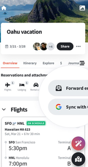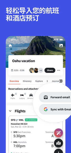 4. 深度集成航班、酒店与景点数据,支持邮件转发或 Gmail 自动同步,信息录入零负担。
