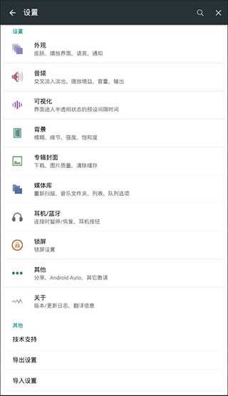 设置”页面提供全方位自定义选项,涵盖外观主题、音频输出、可视化效果、背景行为、专辑封面来源、媒体库扫描规则、蓝牙/耳机策略及锁屏控制等,满足从基础到进阶的各类需求。
