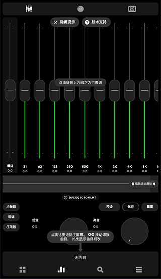 均衡器页面是音效调校的核心区域。点击旋钮上方或下方可进行微调,预设多种风格模板(如摇滚、古典、人声),也可完全自定义十段频点,打造专属听感。