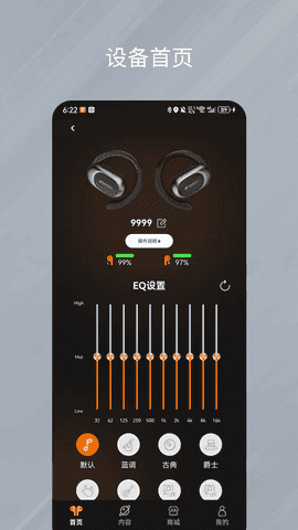 在参数设置”中,你可以精细调节高频、中频、低频等EQ参数,打造专属声音风格;设备状态”页面则实时同步耳机连接情况与电量信息,避免使用中断;通过音效选择”,一键切换适配不同音乐类型的预设模式,让每首歌都发挥最佳效果;而设备命名”功能则帮助你轻松区分多副耳机,提升管理效率。