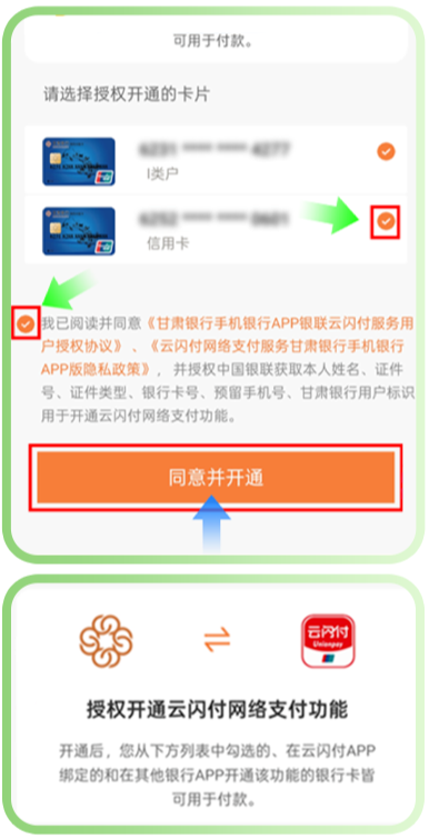 3、首次使用请勾选卡片和我已阅读并同意”,授权同意并开通”云闪付网络支付功能