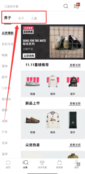 2、分类页面按性别与年龄划分商品类别,包括男士专区、女士专区及童装区域。