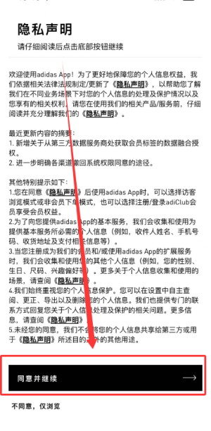 1、首次使用阿迪达斯商城需点击同意用户协议,随后即可进入应用主界面浏览各项功能。