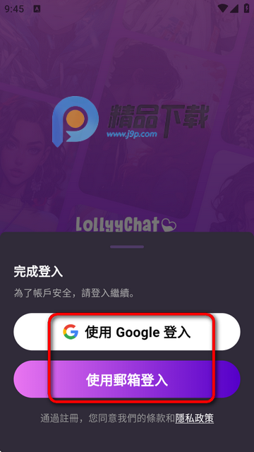 1、下载安装好软件后,进入选择谷歌登录或者邮箱注册。