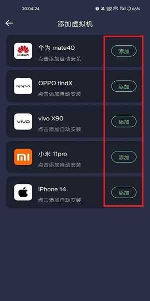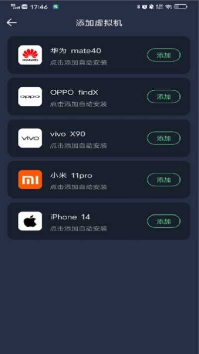 在添加界面中,你可以自由选择主流品牌机型,包括华为、OPPO、vivo、小米甚至苹果风格的虚拟设备,满足不同场景下的伪装或适配需求。