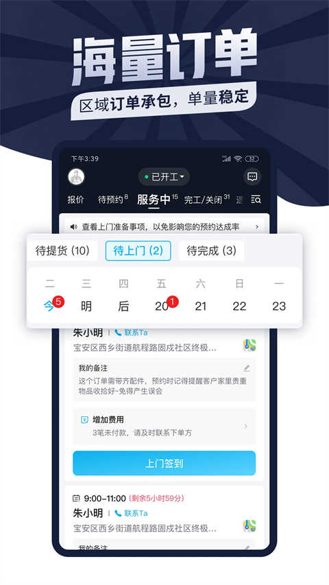 订单管理、日程安排日历展示更清晰,帮助师傅规划行程路线,提升服务效率,更省时间。
