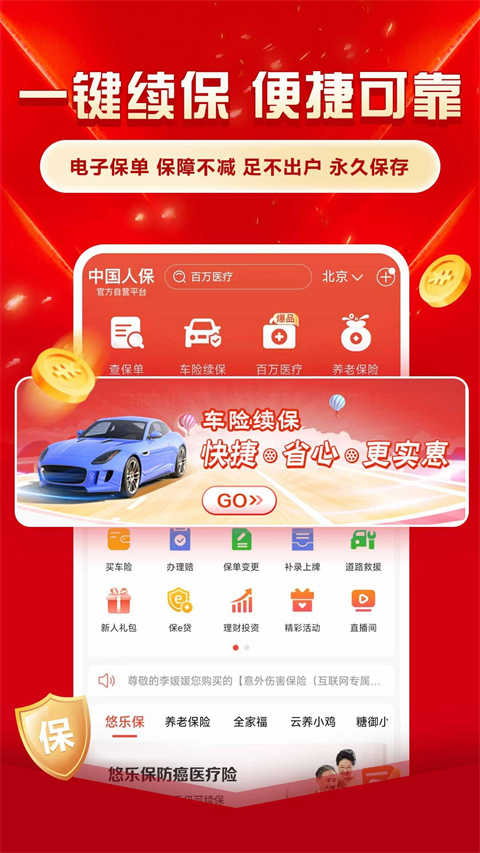 中国人保车险APP官方版(简称:人保车险APP)是一款车险金融服务软件,主要为用户提供产品投保、保单管理、在线报案、积分兑换、驾驶行为记录、违章查询等各类保险行车功能服务。中国人保致力于为您提供最好的保险服务以及汽车保险生活、旅游保险生活以及家庭保险生活的全方位保障,还支持车险私人定制、手机购险、一键续保以及行车贴士、车辆保养让您的汽车保险生活更加轻松。使用人保车险APP”您将享受到车险、财产险、寿险、健康险、公募基金等丰富的产品,以及保单查询、保全续期、线上理赔、行车服务、健康管理、投资理财等一系列优质的服务。