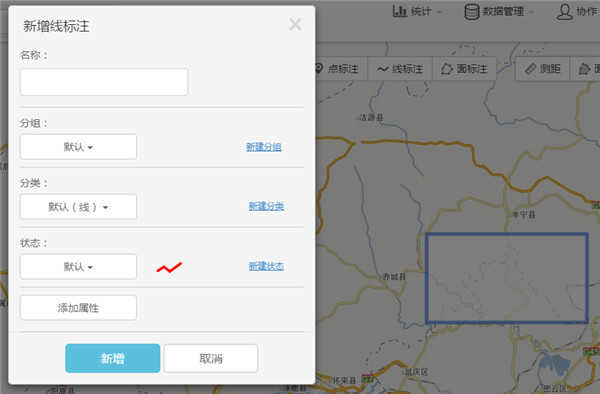 7)、点击【新增】按钮,完成线标注添加,窗体自动关闭,刷新地图显示新增线标注。