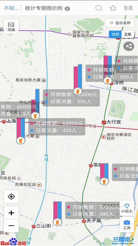 连锁企业可将所有门店在图标注,可录入店长、营业面积、员工数量、营业额、店堂照片等数据。各门店可协作共同绘图输入各自数据。