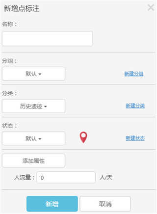 3)、在新增点标注”窗体中,填入标注名称和属性值并选择该标注所属分组、分类和状态。(新增点标注”窗体具体操作见属性编辑)