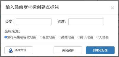 1)、移动鼠标至地图右上方绘制工具中的点标注上,点击坐标定位,弹出输入经纬度坐标创建点标注”窗体,如图1-2。