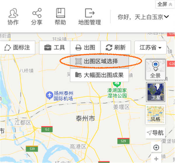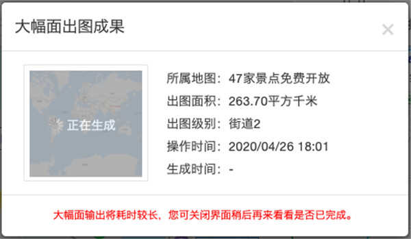 兰图绘的出图功能可以将您框选的地图区域输出为图片;普通出图无法一次性输出大范围的图片,如果您需要一次性输出很大范围的图片,可以使用大幅面出图。