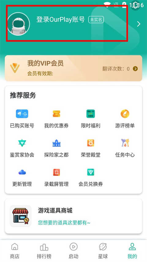 1、进入谷歌加速器App(OurPlay)主界面后,点击我的”,进行登录;