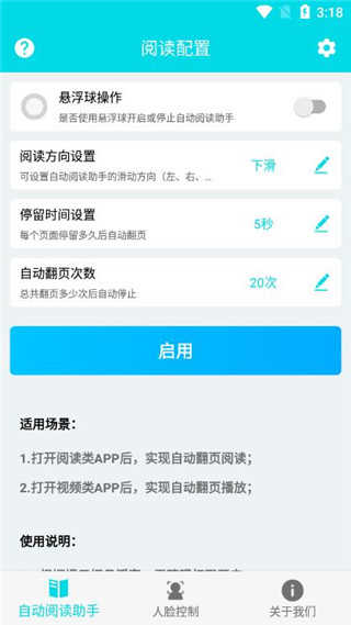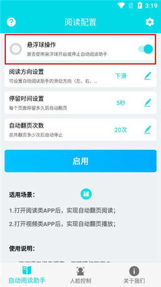 3、确认配置无误后,点击开启或通过悬浮球开启自动阅读模式