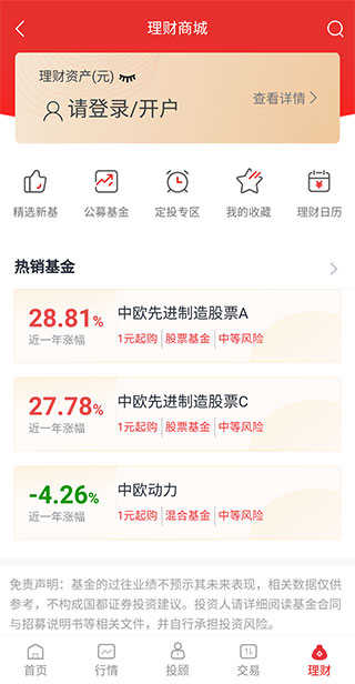 5、【理财】页面为用户推荐了一些时下的热门基金,用户可以根据自身情况合理选购,也可以在此查看自己的理财资产。