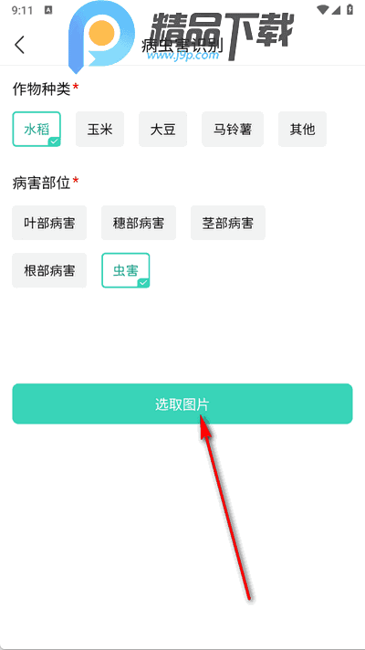3、选择作物种类、病害部位后选取图片即可识别