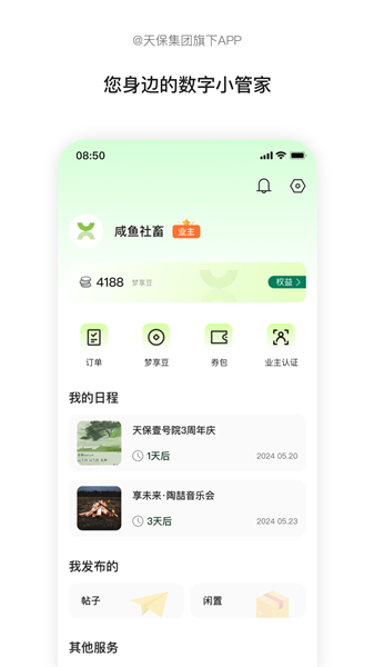 天保享未来APP是款功能强大的房产服务软件。在这里就能享受到房屋租赁、物业管理和项目管理等诸多服务,帮助你能过上更加温馨美好的生活。诸多社区动态内容实时更新推送,可实时在应用查看,了解附近精彩动态,并能在线加入自己感兴趣的活动,和大家一起体验有趣的生活,享受美好的服务;同时可以在线创建公会发布动态,让更多有相同爱好的人加入,共同分享趣味事迹。