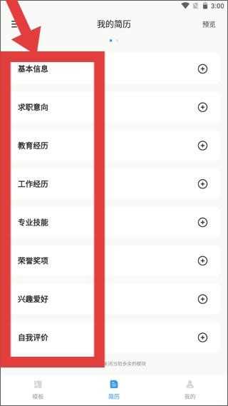 打开最美简历制作模板APP,首页清晰划分基本信息”求职意向”等核心模块,点击即可展开编辑,快速填充个人资料,构建完整简历内容。