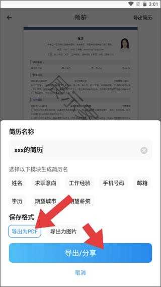 在导出设置界面,你可以自定义简历名称,并选择保存为PDF或高清图片格式,方便打印、投递或分享至招聘平台、社交软件,高效完成求职准备。