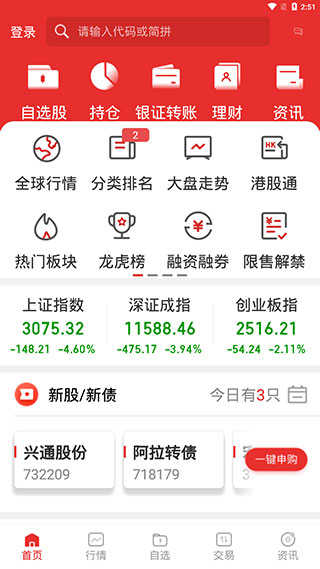 1、进入软件之后,我们就可以在【首页】找到一些比较常用的功能,例如自选股、持仓、银证转账、理财、资讯等。