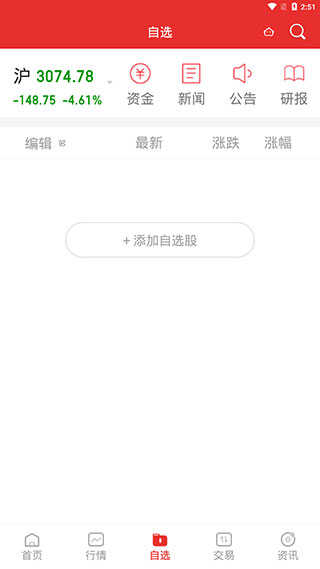 3、如果用户想要添加自选股,可以来到【自选】页面进行操作,而且你还可以查看具体的资金、新闻、公告和研报。