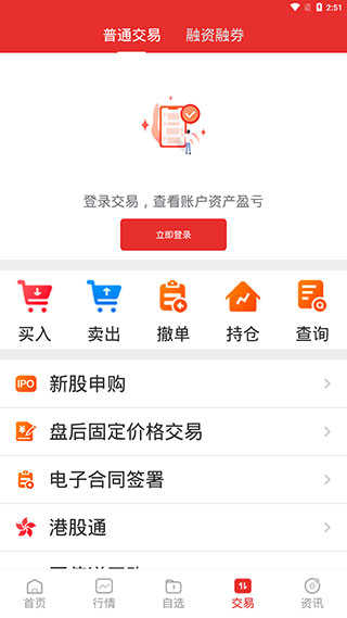 4、关于证券的买入和卖出,用户需要在【交易】页面进行注册登陆后才能继续操作,这里的交易还分为普通交易和融资融券两种。