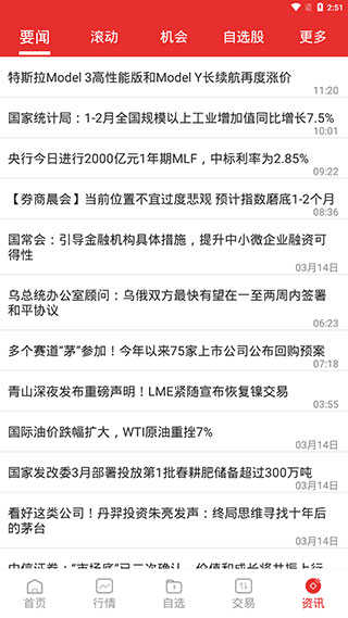 5、【资讯】页面为用户展示的都是证券方面的新闻内容,这些内容也细分为了要闻、滚动、机会、自选股等不同板块。