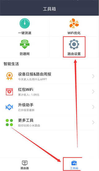 1、点击底部工具箱”,然后找到路由设置”。